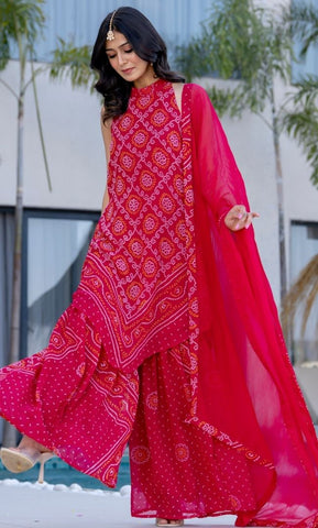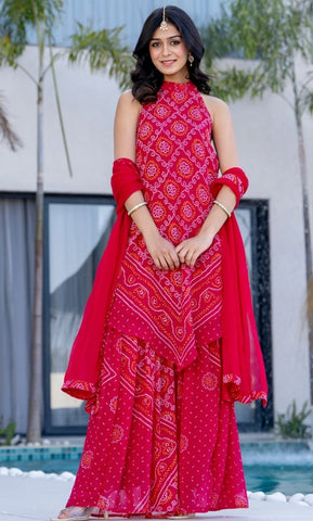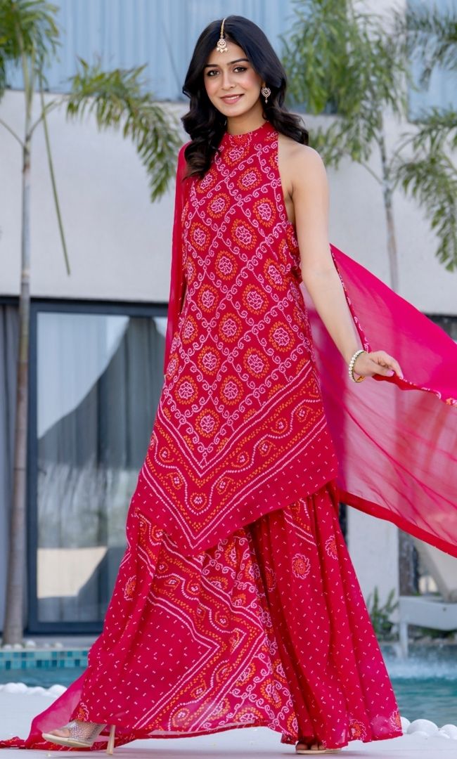 A captivating halter-neck sharara dress crafted from vibrant bandhej fabric. The asymmetrical top adds a touch of modern flair, while the flowing sharara pants create a graceful and elegant look.