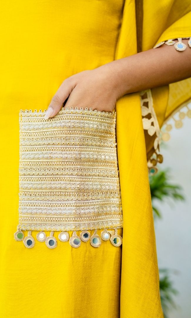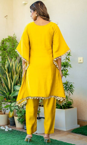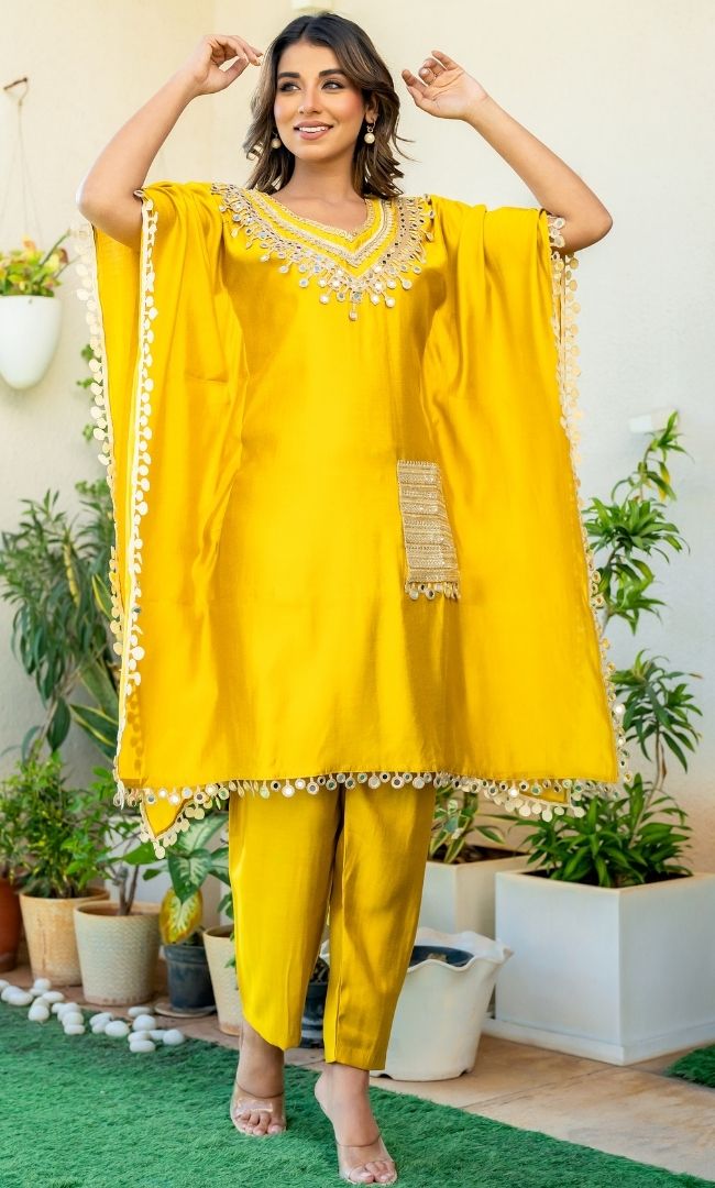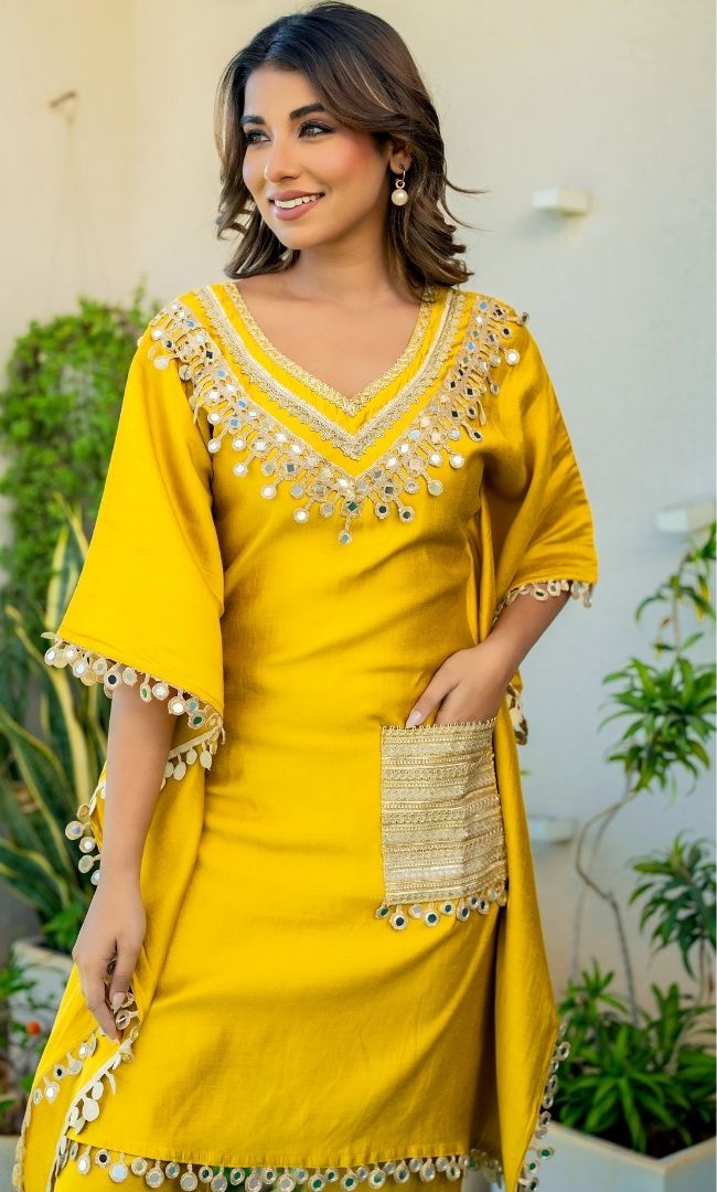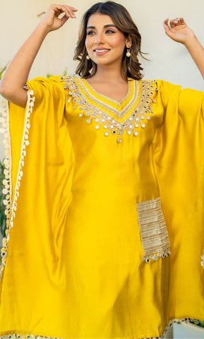 Embrace the subtle shine of this shimmering Mustard kaftan set. The delicate mirrorwork lace detailing adds a touch of understanding elegance to comfort.