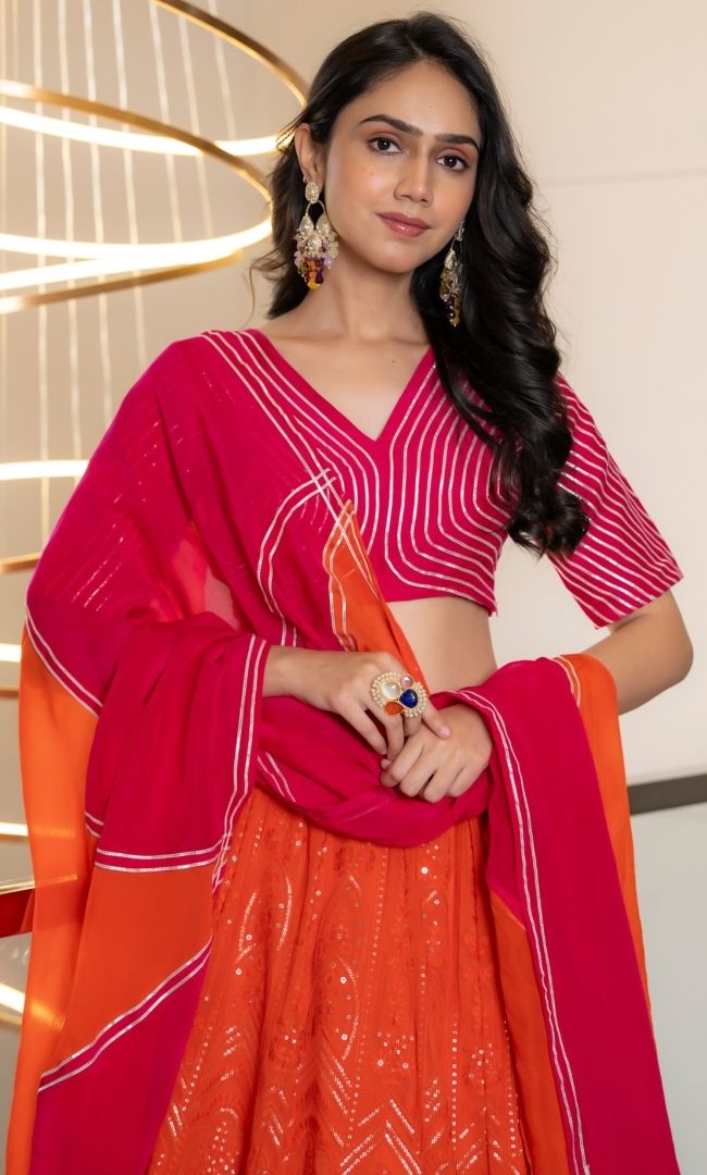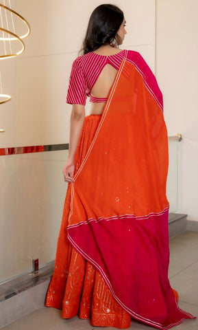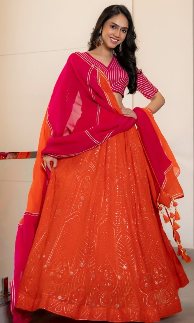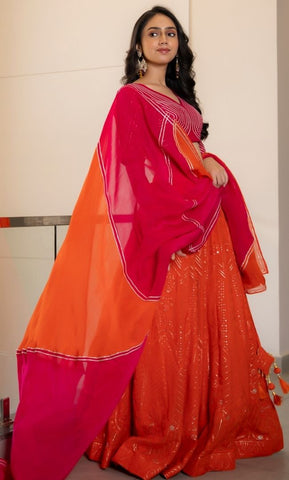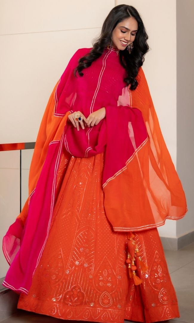 This orange lehenga choli set is perfect for festive occasions. It features a pink blouse with silver detailing, an orange skirt with embellishments, and a matching orange dupatta.