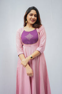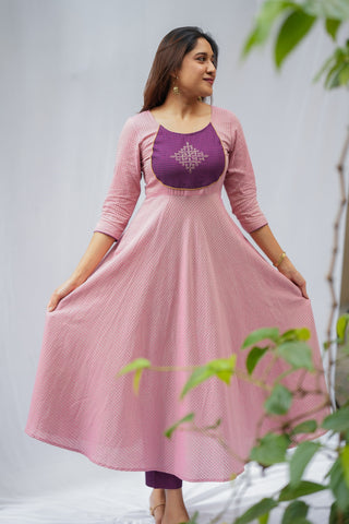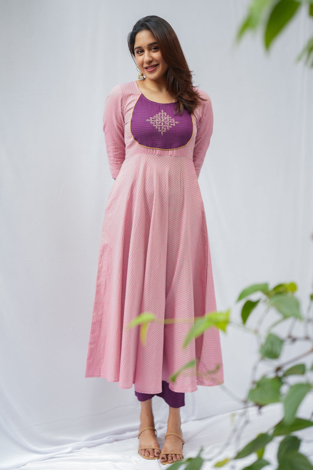 A beautiful baby pink Anarkali kurta featuring delicate self-checks and stunning golden kolam embroidery.