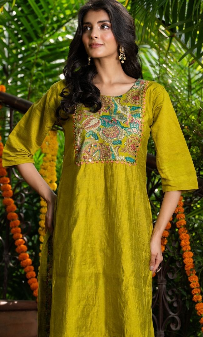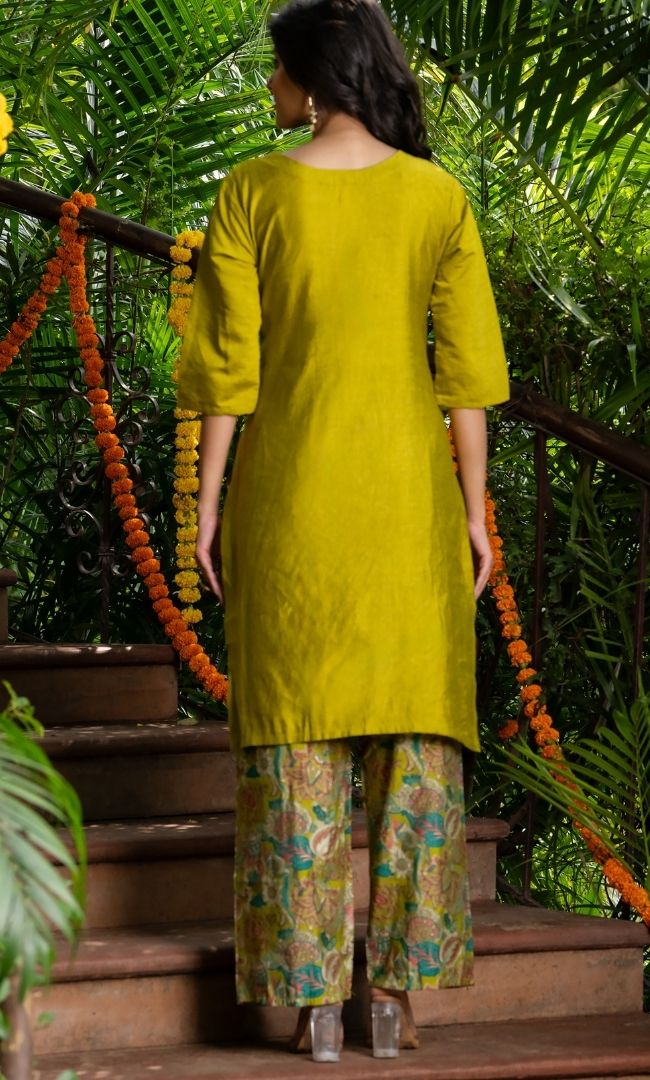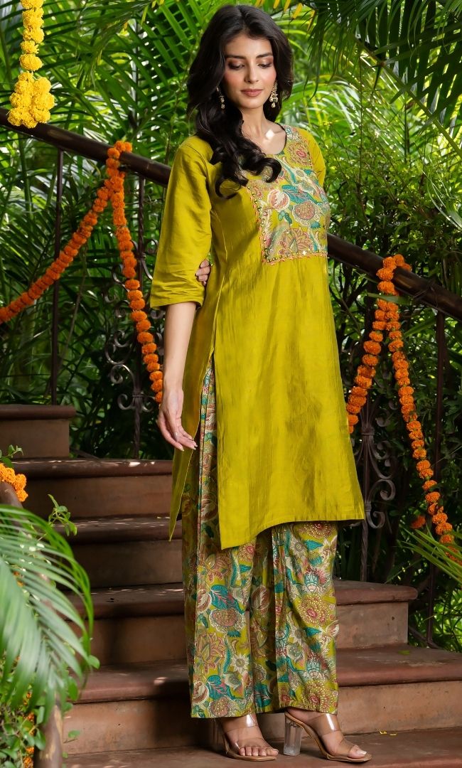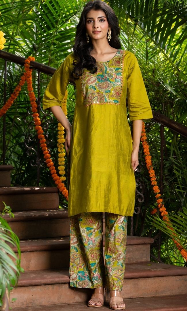 A stylish co-ord set crafted in vertical-textured fabric, paired with printed pants for a contemporary look. The kurta features printed fabric detailing on the yoke, adding a subtle yet eye-catching contrast. Comfortable yet chic, this set is perfect for casual outings, festive brunches, or evening get-togethers.
