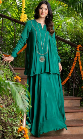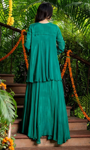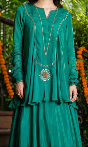 An emerald green top and skirt set adorned with delicate golden embellishments at the neckline and waist. The flowing skirt adds grace, making it ideal for festive and celebratory occasions.