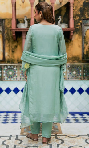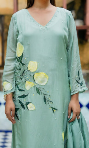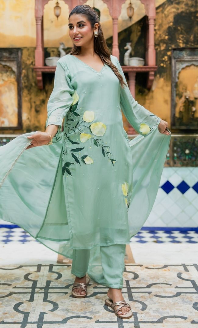 This elegant mint green kurta set is crafted in fine organza with soft cotton pants and a matching organza dupatta. Delicately hand-painted floral motifs enhanced with fine handwork add a touch of artistry and grace, making it a refreshing choice for festive gatherings and celebrations.