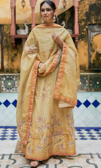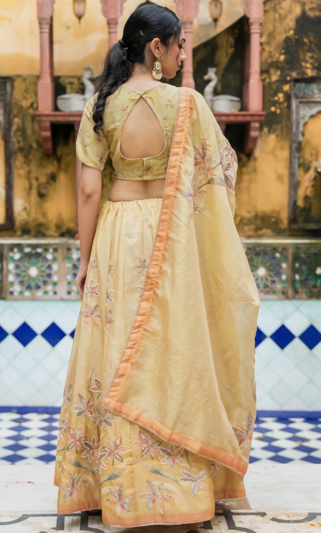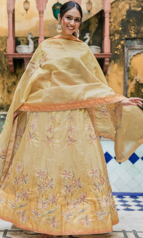 Crafted in delicate tissue fabric, this lehenga set is adorned with intricate handwork highlights. The floral motifs across the lehenga add a graceful charm, paired with a matching blouse and dupatta for a refined festive look. Perfect for weddings, celebrations, and special occasions.