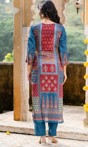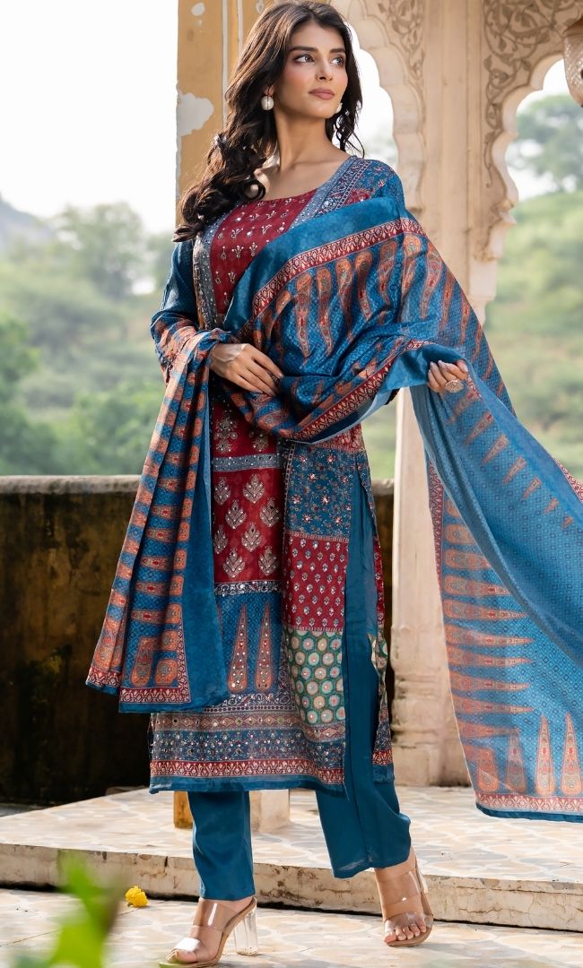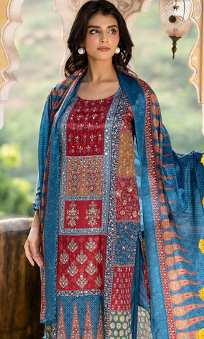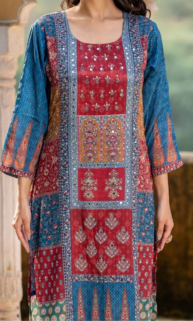 A vibrant digital print suit set crafted in rich multicolor tones, paired with a matching bottom and dupatta. The look is elevated with delicate mirror work embellishments, adding a festive sparkle. This ensemble blends modern prints with traditional detailing, making it perfect for celebrations, gatherings, and special occasions.