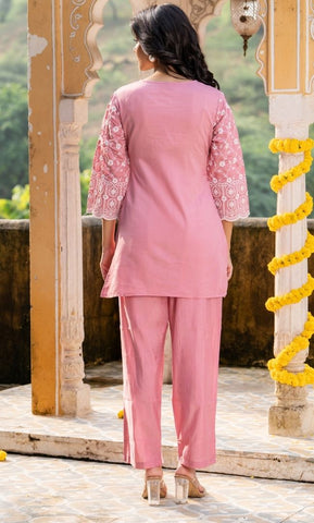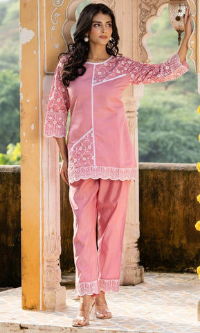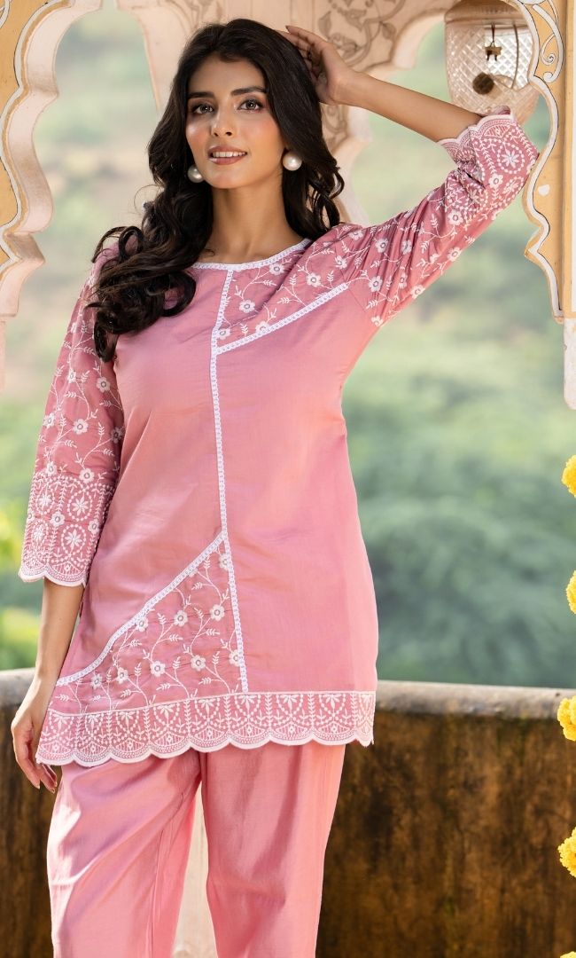 A rose pink kurta highlighted with fine white machine embroidery, featuring floral motifs on the sleeves and side panels. The scalloped borders on the hem and cuffs add a refined touch, making this ensemble elegant yet comfortable. Ideal for casual outings and semi-formal occasions.