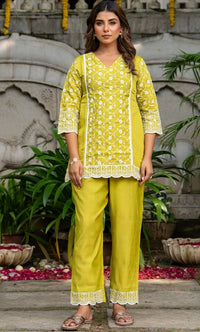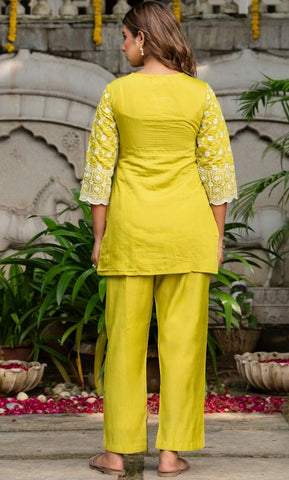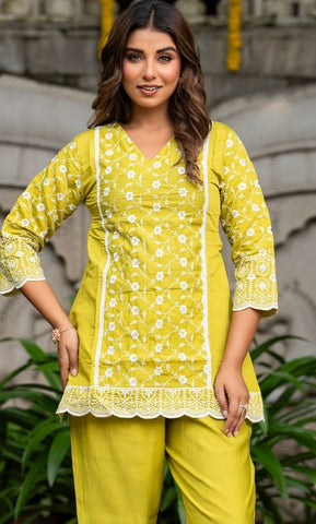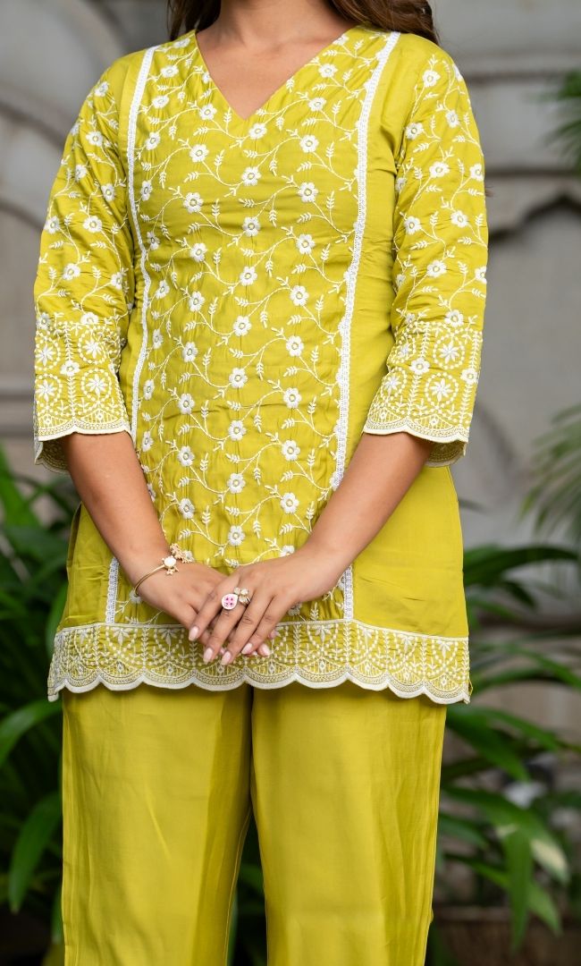 Crafted in a refreshing green hue, this kurta pant set features intricate white machine embroidery. The detailed floral motifs and scalloped borders enhance its elegance, making it a perfect choice for daytime celebrations, festive gatherings, or casual get-togethers.