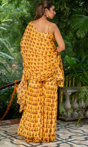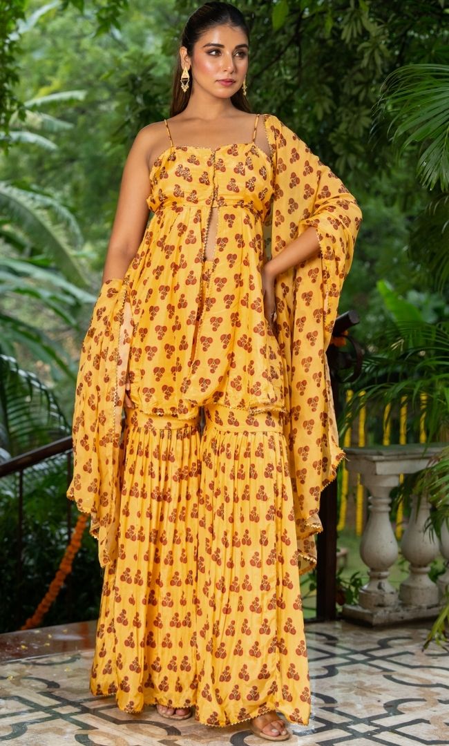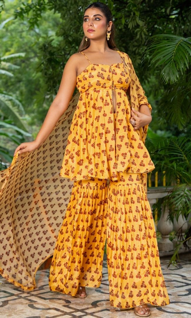 Crafted in lightweight printed organza, this vibrant sharara set features delicate handwork detailing on the yoke. The flowy silhouette paired with its playful print makes it perfect for festive celebrations.