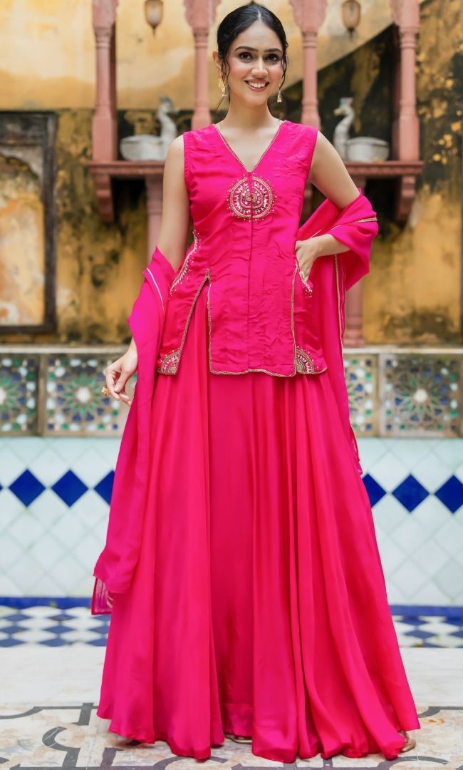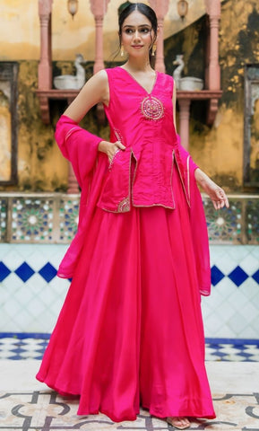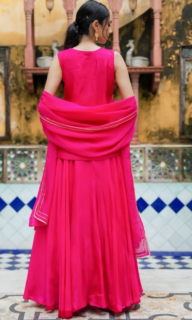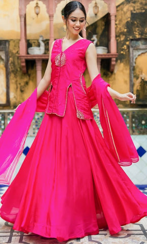 A stunning rani pink set featuring delicate handwork, a flowing skirt, and a coordinated dupatta. The graceful silhouette makes it ideal for weddings and celebrations.