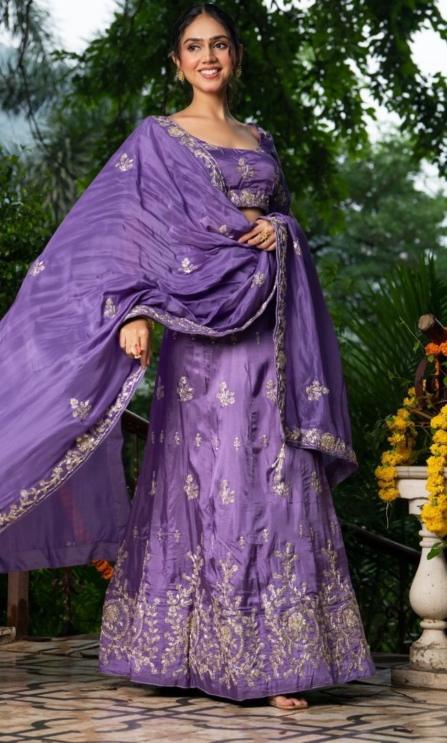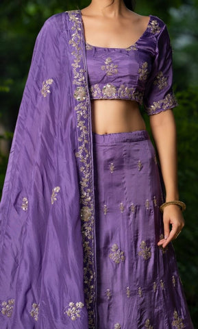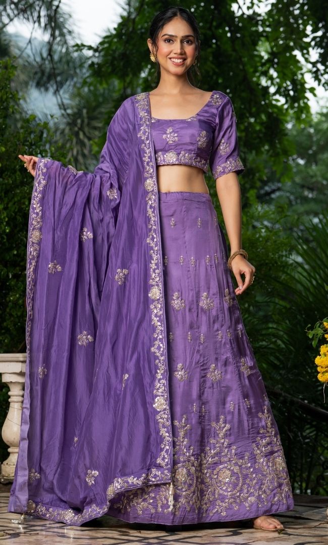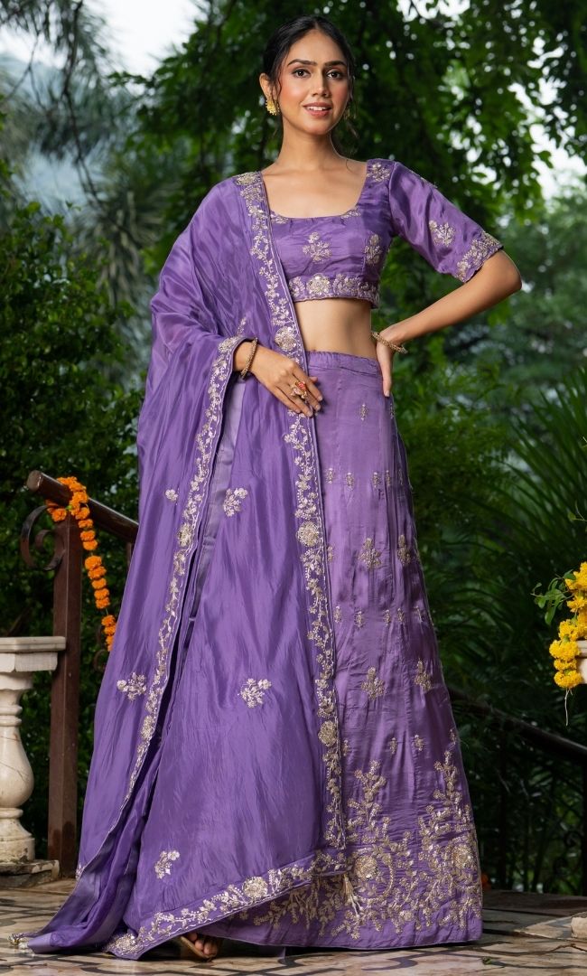 Featuring intricate machine embroidery with zari work, this elegant lehenga set comes with a round-neck blouse with half sleeves and a side-zip closure. The richly crafted upada silk lehenga adds timeless elegance, making it a perfect choice for weddings, festive occasions, and celebrations.