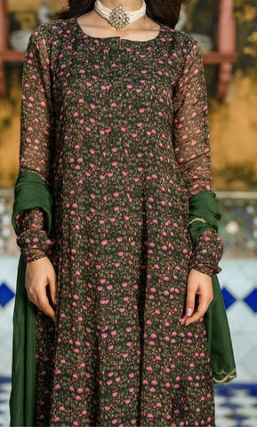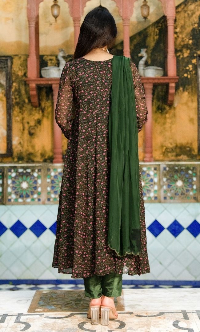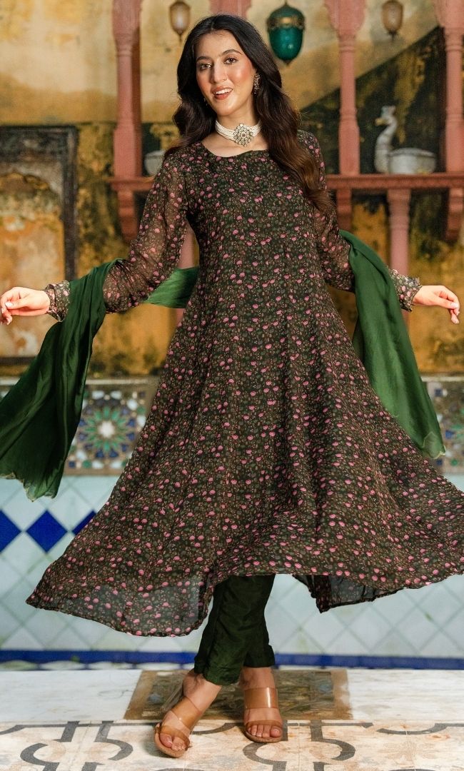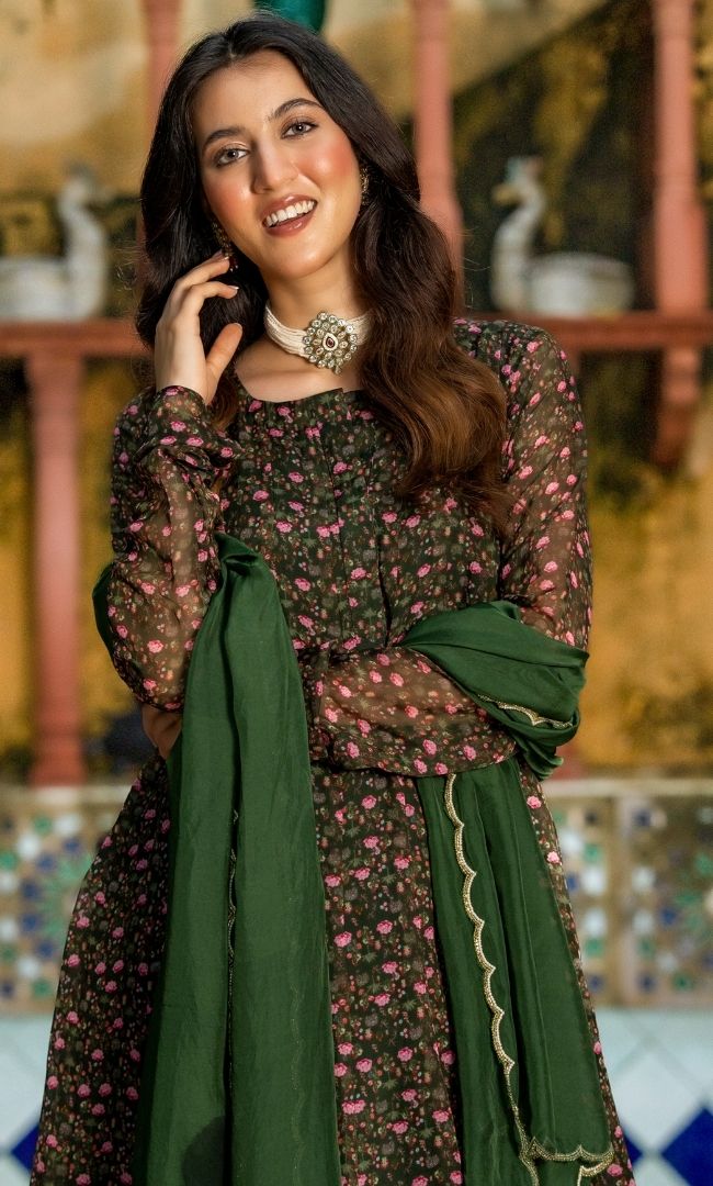 An elegant organza anarkali kurta with matching dupatta, paired with sleek upada silk pants. The lightweight organza gives a graceful flow, while the rich upada silk adds luxury and comfort. The look is enhanced with a dupatta featuring scallop-cut edges, lending refined charm. Perfect for festive gatherings, evening celebrations, and special occasions.