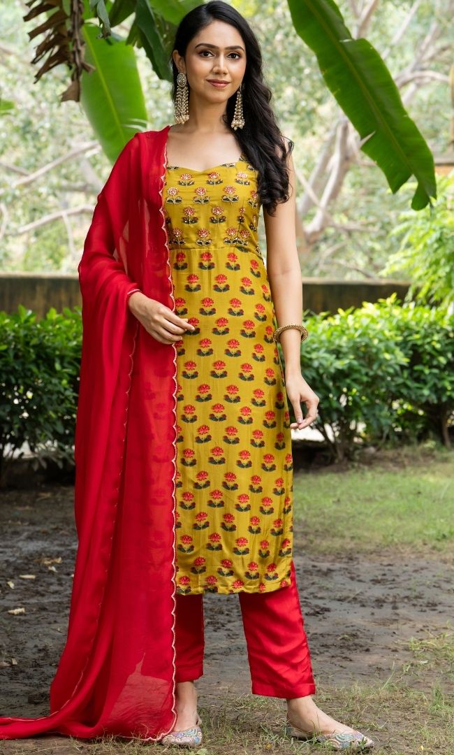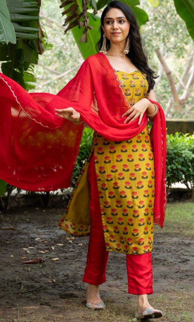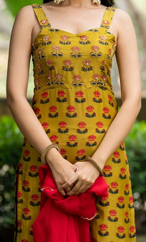 This vibrant green printed kurta paired with straight pants exudes effortless charm. The playful motifs add a touch of tradition, while the contrasting pink dupatta enhances the festive appeal. A perfect pick for casual celebrations, day gatherings, or a cheerful ethnic look.