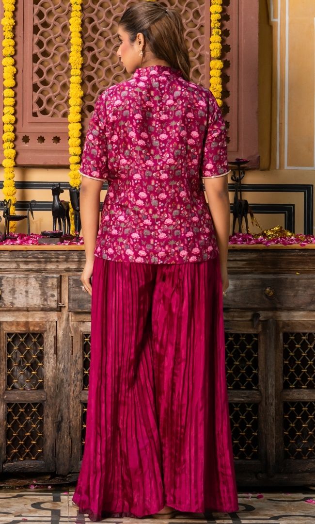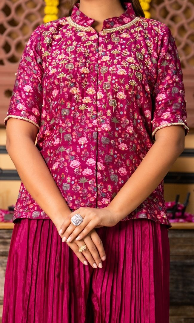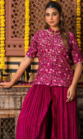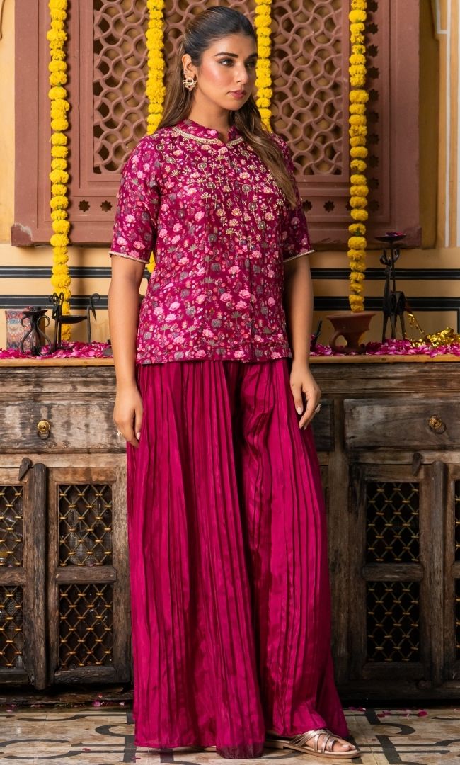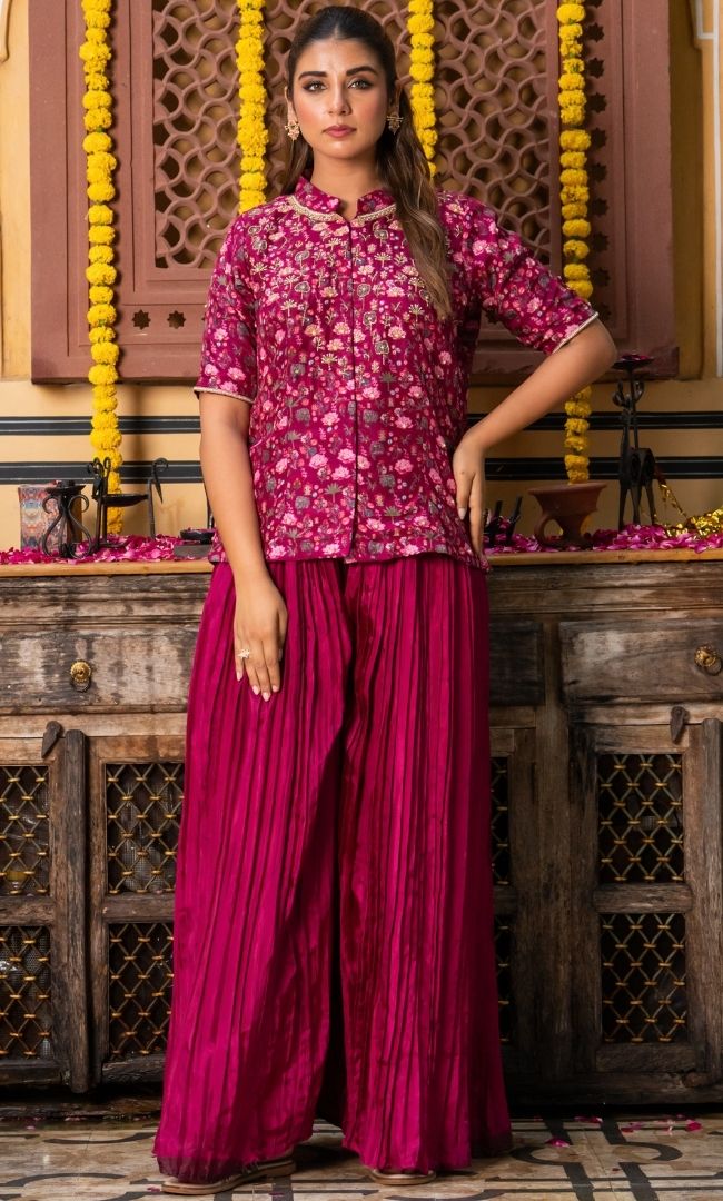 This wine coord set features a beautifully handworked floral top paired with elegant pleated palazzos. The intricate detailing on the top adds richness, while the flowy palazzos bring comfort and charm. A perfect mix of festive grace and modern chic.