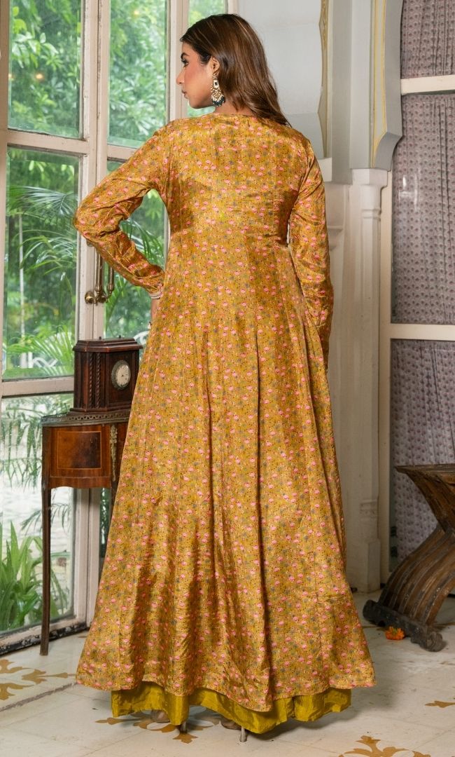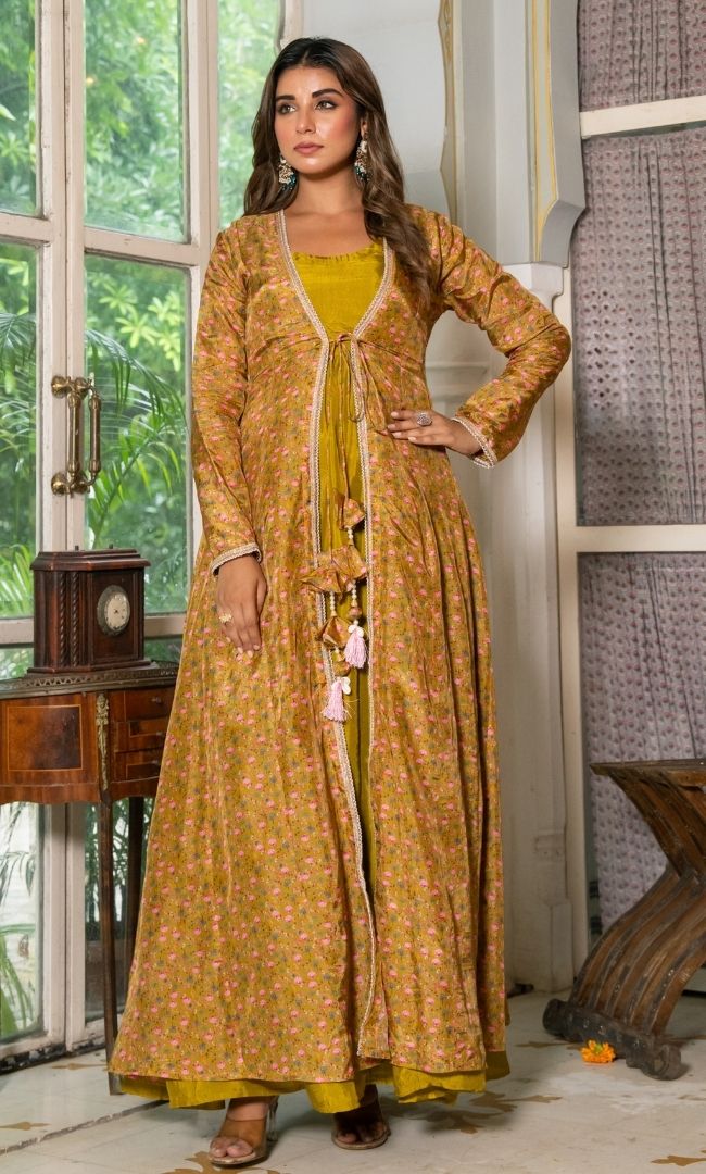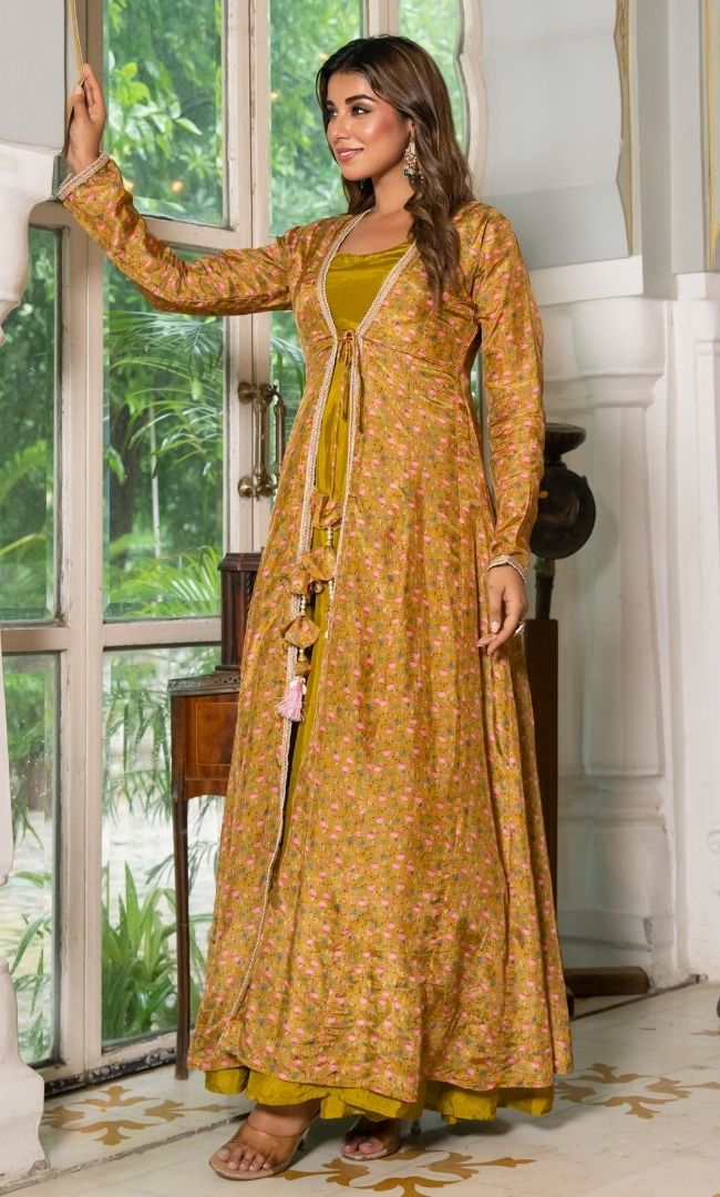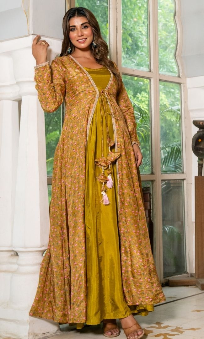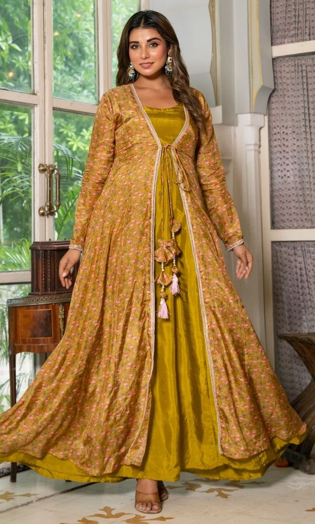This elegant green-colored Anarkali paired with a beautifully printed shrug brings a perfect blend of tradition and modern style. The rich tone and flowy silhouette make it ideal for festive occasions and evening gatherings.