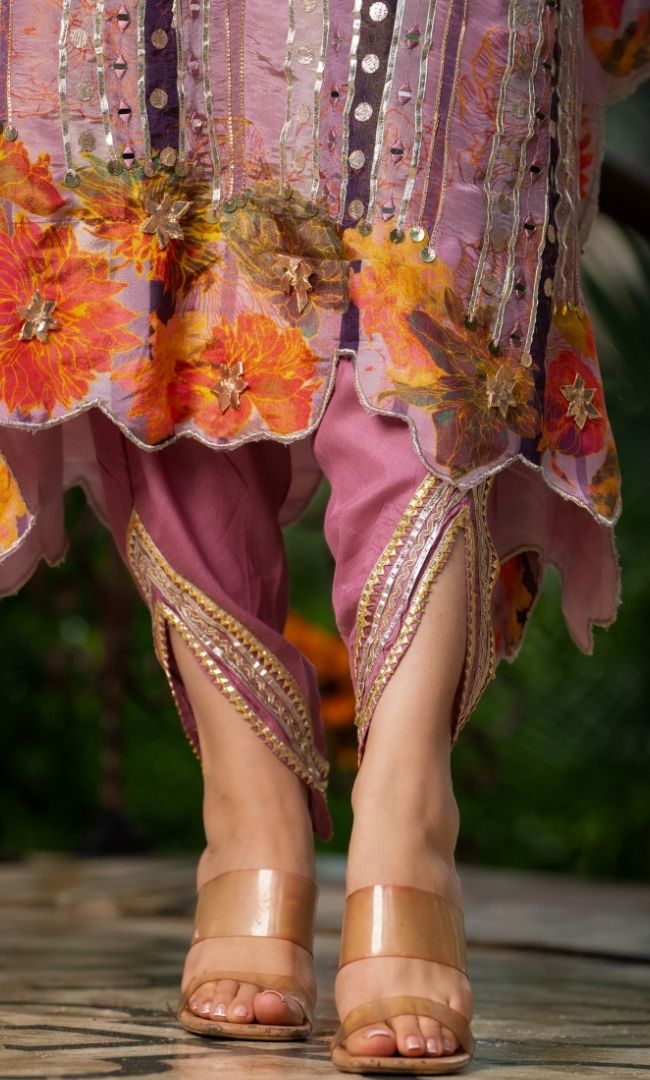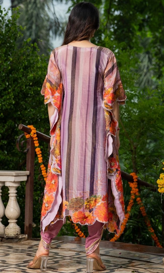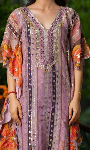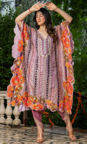 A chic and festive ensemble featuring a flowy crepe kaftan paired with muslin dhoti pants. The kaftan is beautifully adorned with gota work and mirror detailing, adding a vibrant sparkle to your celebration look.