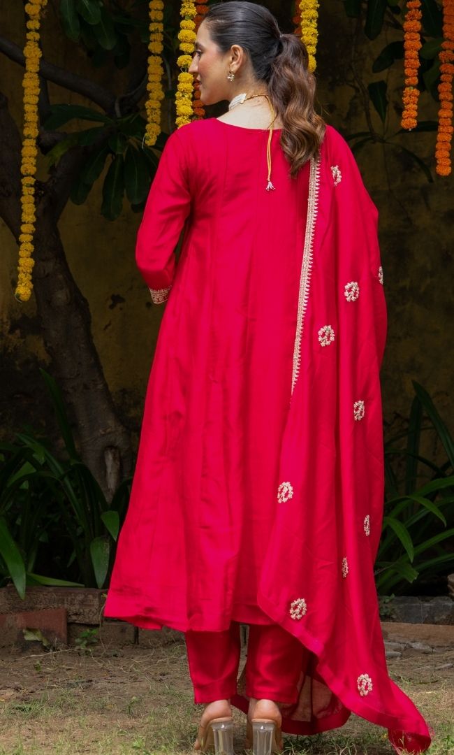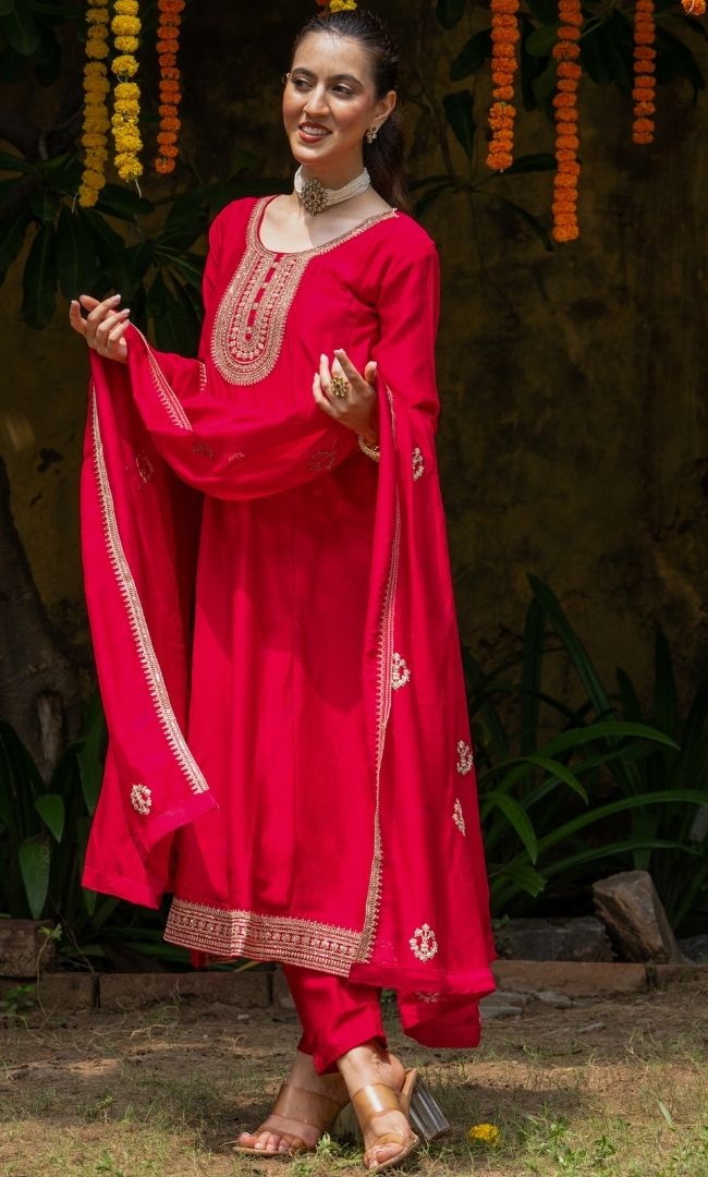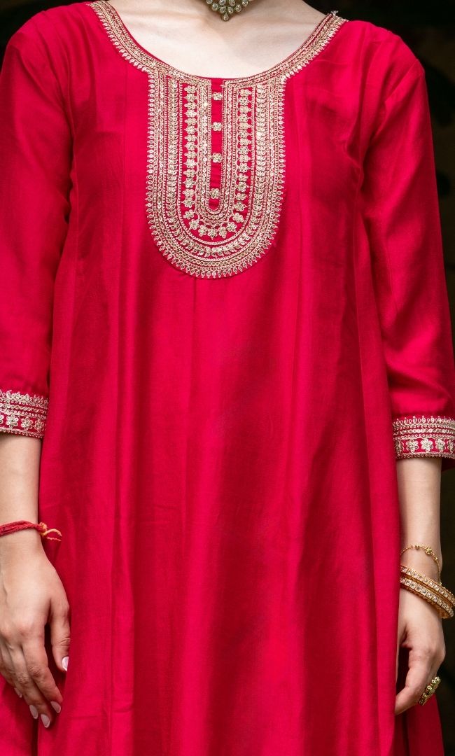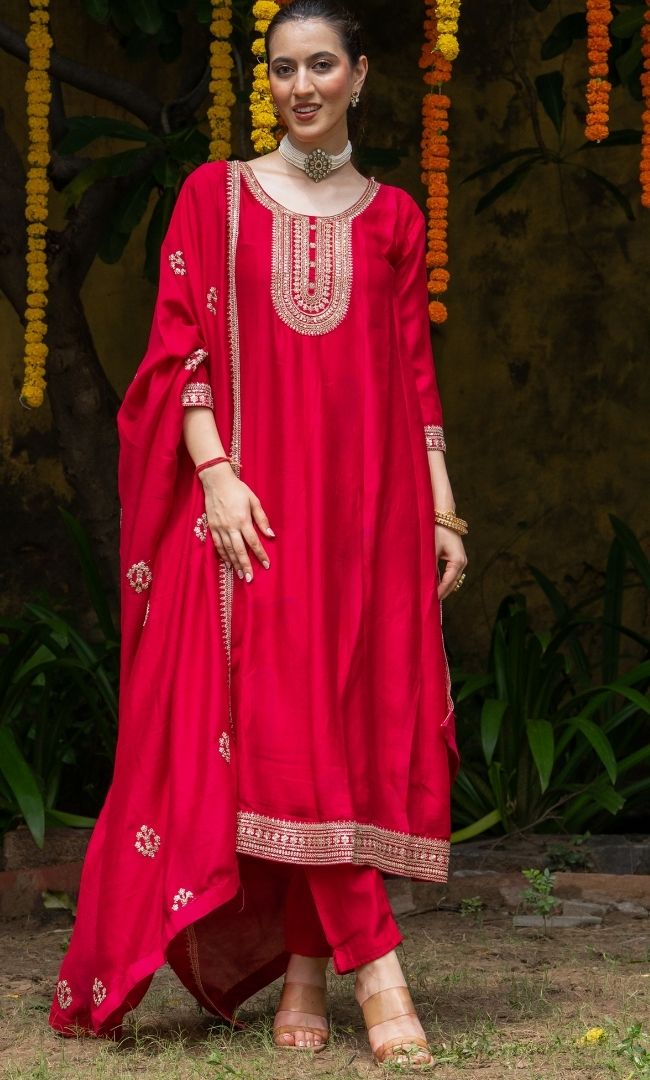 A striking kurta set in vichitra fabric, styled with straight pants and a flowing dupatta. The ensemble is beautifully enhanced with machine embroidery and intricate zari work, giving it a rich festive appeal. Elegant yet comfortable, this outfit is a perfect choice for weddings, festivals, and celebratory occasions.