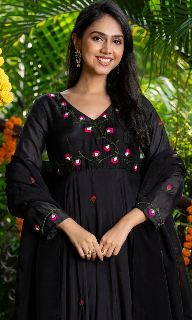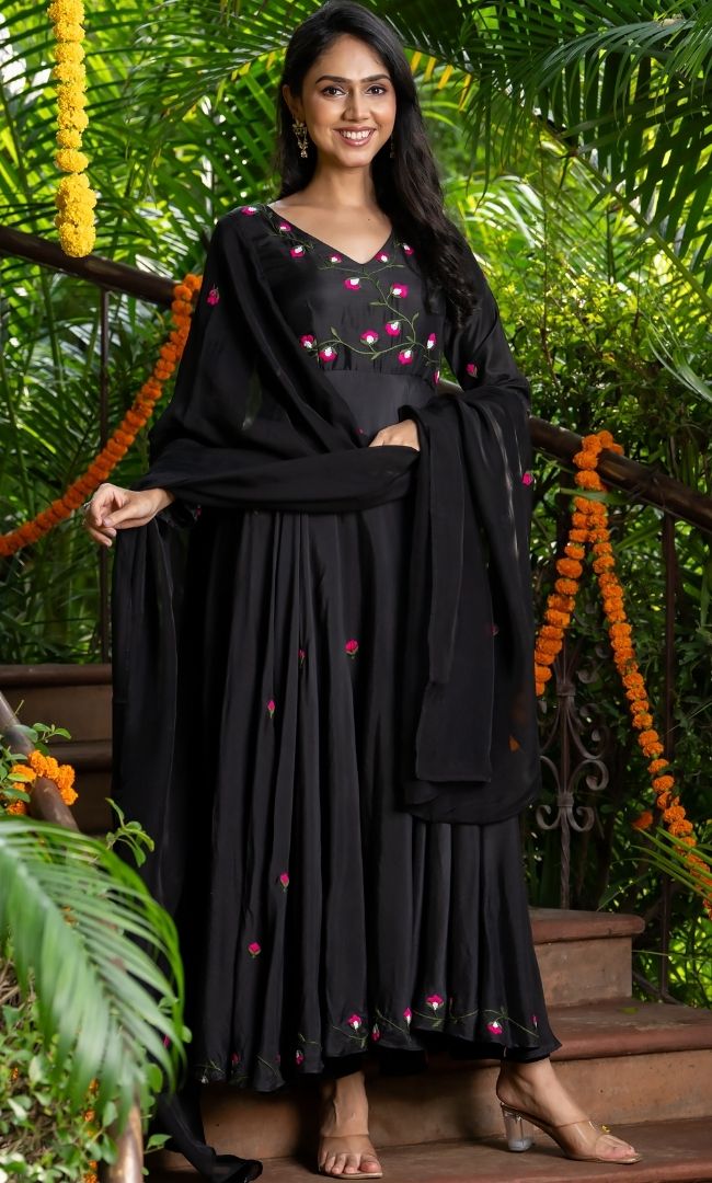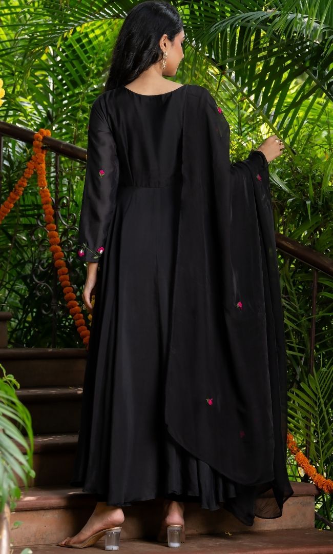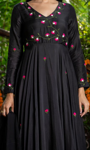Exude grace in this black Anarkali set, designed with a flowy silhouette and delicate pink floral embroidery on the neckline, hem, and sleeves. The dramatic flared sleeves add a modern touch, while the timeless Anarkali cut makes it perfect for festive gatherings, weddings, and evening celebrations.