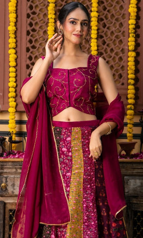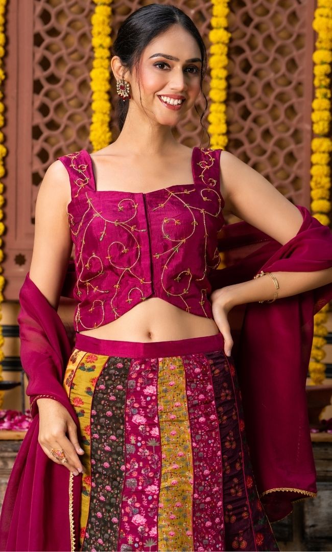Multi-Printed Lehenga Set – A vibrant lehenga paired with a sleeveless square-neck blouse featuring front-hook closure and delicate handwork. The look is completed with a matching dupatta adorned with handwork detailing.